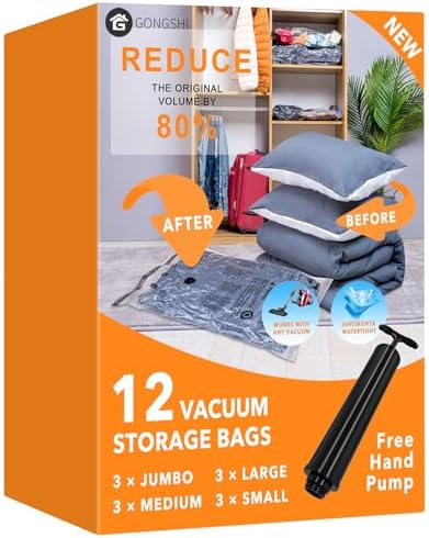 GONGSHI Vacuum Storage Bags are great for maximizing space saver for you! They can be used for storing variety size items such as:bedding clothes, blankets, pillows, plush toys, and more. Our pack comes with 12 bags of 4 different sizes to fit your every need! And they make everything 3 times smaller! And you can fit many things in these bags! Even the biggest duvet, blanket, or giant beach towels fit snugly in these bags!