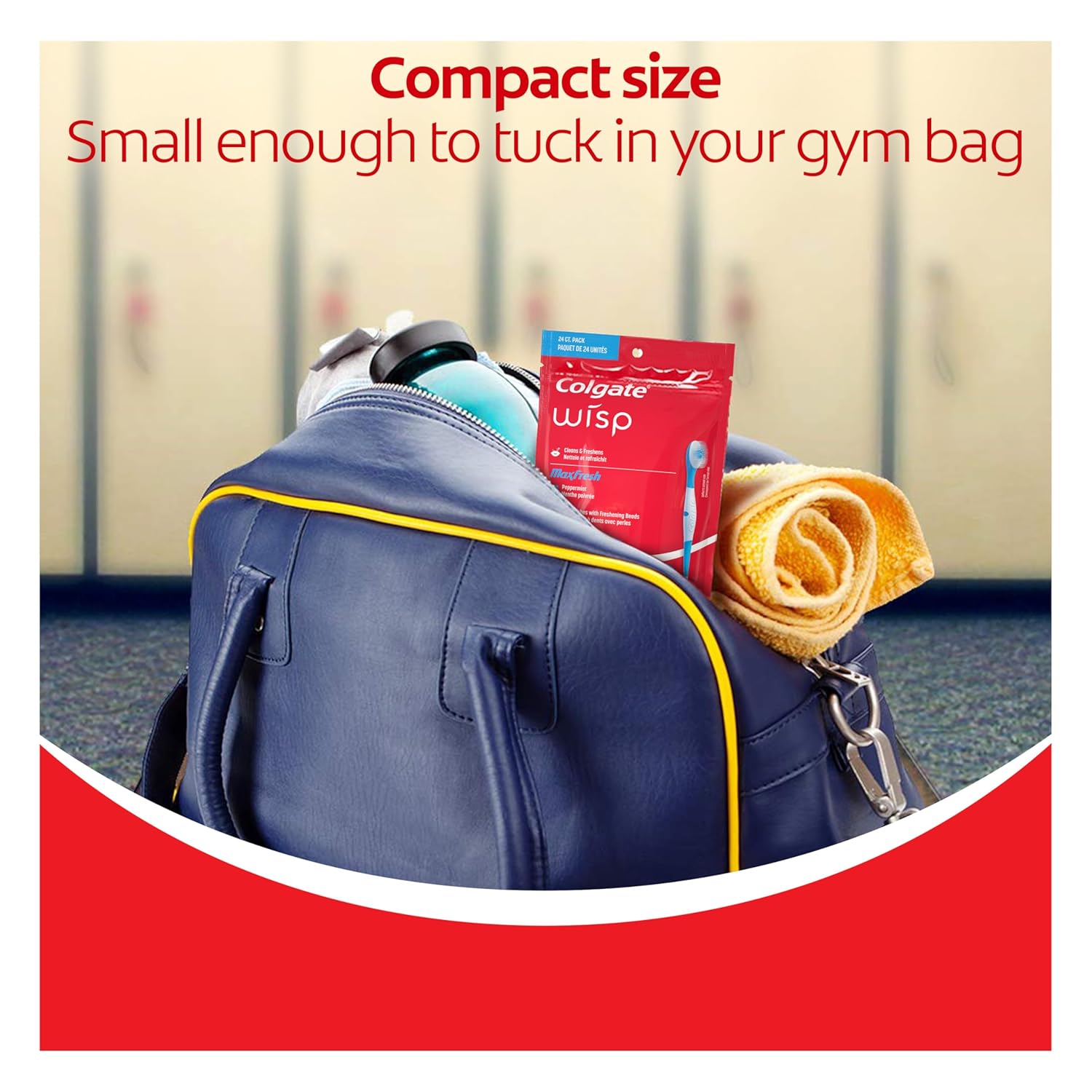 Get clean teeth and fresh breath on the go with the Colgate Max Fresh Wisp Disposable Mini Toothbrush, Peppermint. This pocket-sized mini-toothbrush brush delivers the freshness of gum and the clean of a toothbrush in one effortlessly portable device. Its built-in, sugar-free peppermint bead easily dissolves and delivers a rush of minty freshness while the bristles gently remove food and other particles. A soft pick at the handle base of this disposable toothbrush removes food particles from any hard-to-reach areas. No water or rinsing is necessary. Recycle with Terracycle.