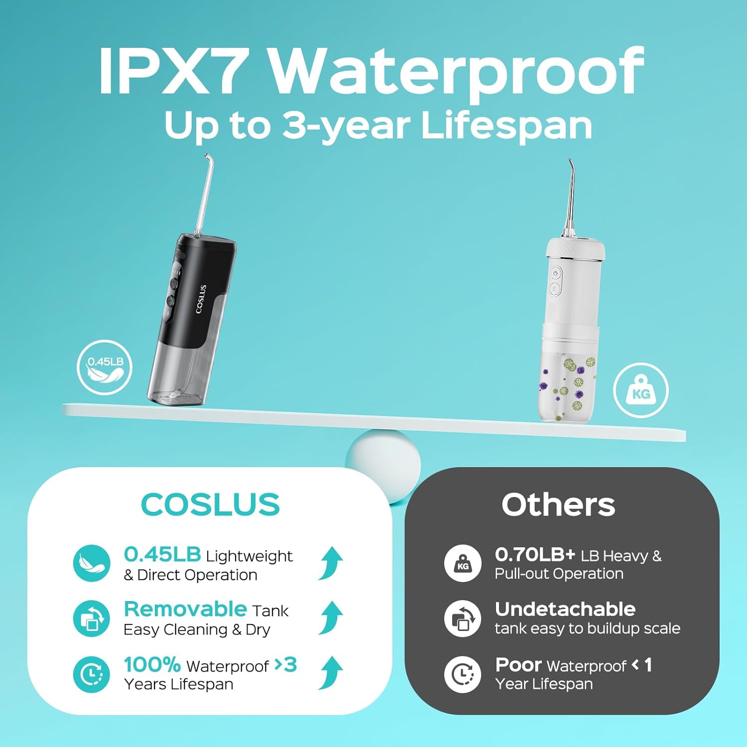 Easy-go, Mini Ultra-Portable Design for Frequent Travelers: Weight comparable to common smartphones.This cordless travel water flosser pick has a compact size design and space-saving that fits in your palm, toiletry bag or travel bag for airplane, traveling business trip oral care, camping or daily commuting – the mini-sized lightweight slimmest water flosser is an ideal choice for oral care on-the-go use, keeping your teeth clean anytime, anywhere