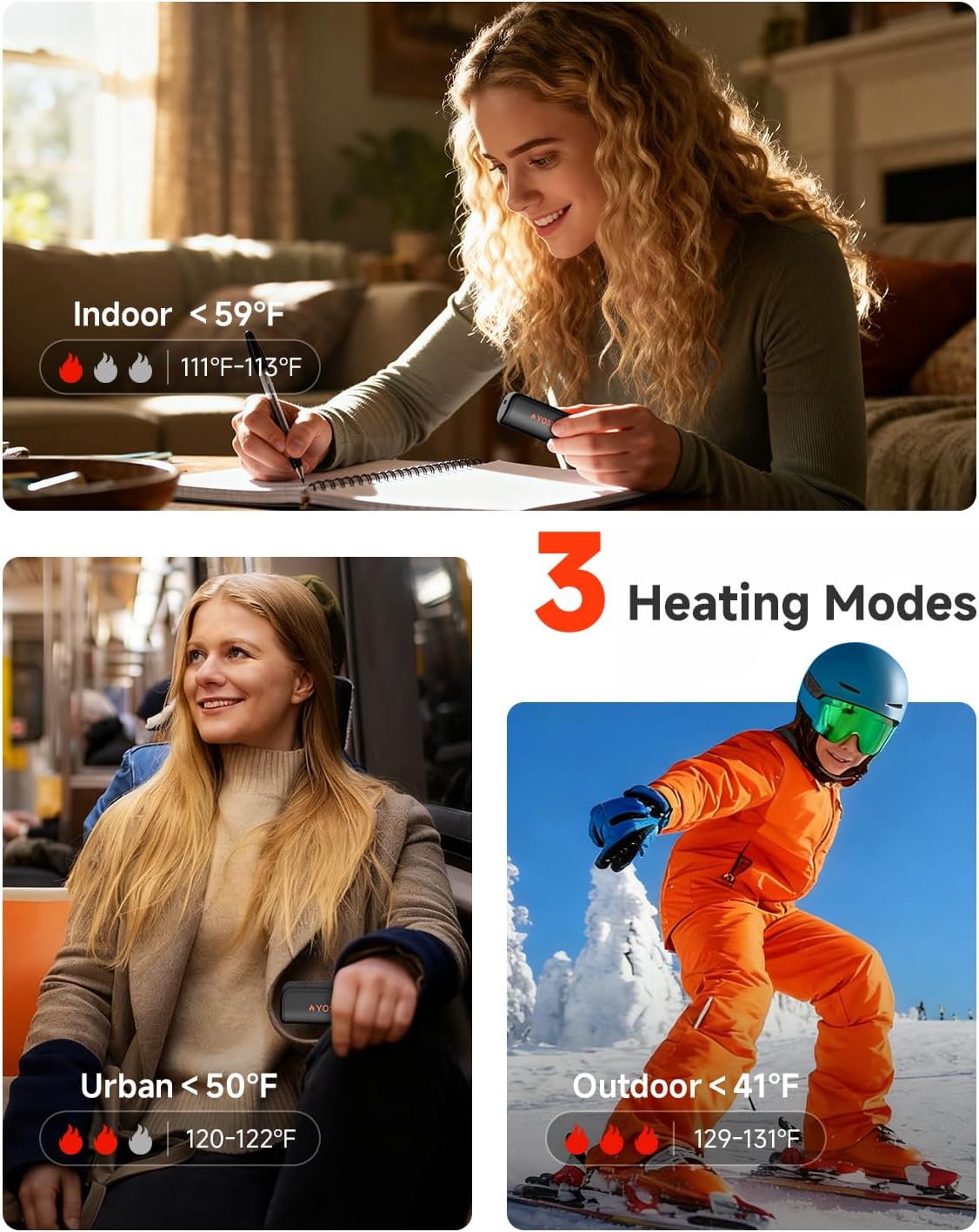 🌡 Three Heating Level: This hand warmers rechargeable offers three adjustable temperature settings—Low (111-113°F), Medium (120-122°F), and High (129-131°F)—to deliver comfortable, personalized warmth for different scenarios and climates