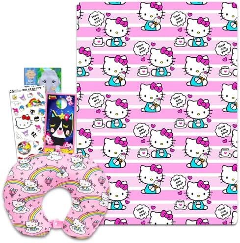 Hello Kitty Neck Pillow and Blanket Set – Bundle with Hello Kitty Travel Neck Pillow, Fleece Blanket, Stickers, Create a Face Activity Book, More | Hello Kitty Travel Accessories. This Hello Kitty travel set comes with everything your little one needs to be comfortable on any trip: a travel neck pillow and a 45″ x 60″ fleece throw blanket. Also includes a create a face sticker activity book. Perfect for planes, trains, and cars, this Hello Kitty travel blanket and neck pillow set is perfect to ensure your child is cozy wherever you’re going. This Hello Kitty neck pillow and blanket set is perfect to give as a gift to your favorite Hello Kitty enthusiast. Officially licensed Hello Kitty travel set also comes with bonus Hello Kitty stickers and a Beach Kids cat door hanger.