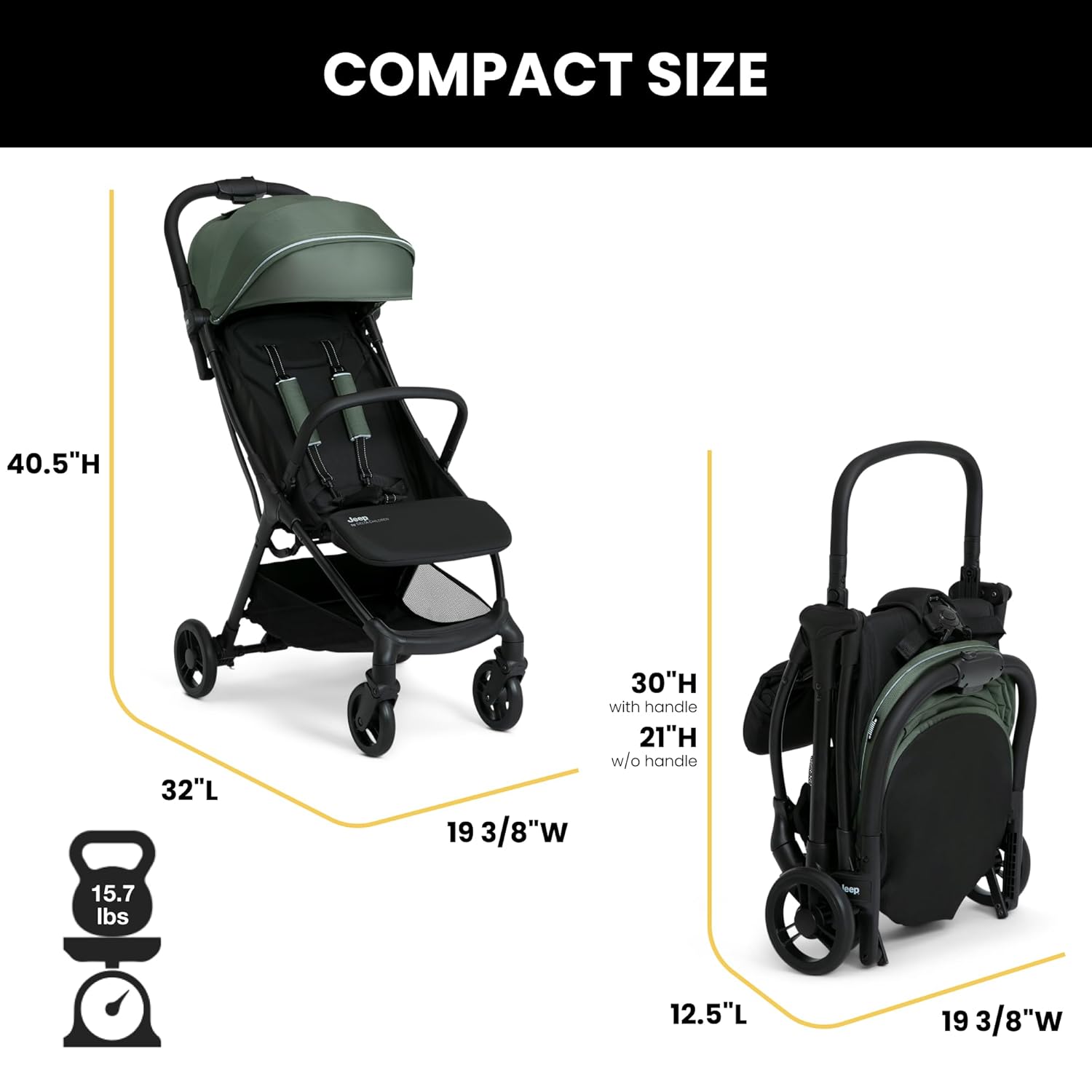 LIGHTWEIGHT & COMPACT: This stroller only weighs 15.7 lbs. | Stroller easily folds within seconds | Assembled: 33.5″L x 19″W x 40″H | Folded: 12.5″L x 19″W x 29″H