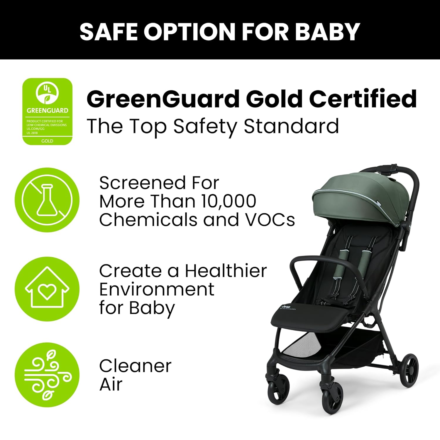 SAFE OPTION: GREENGUARD Gold Certified, this stroller contributes to healthier air quality around baby | JPMA certified; meets or exceeds ASTM and CPSC standards | 5-point safety harness with comfort shoulder pads