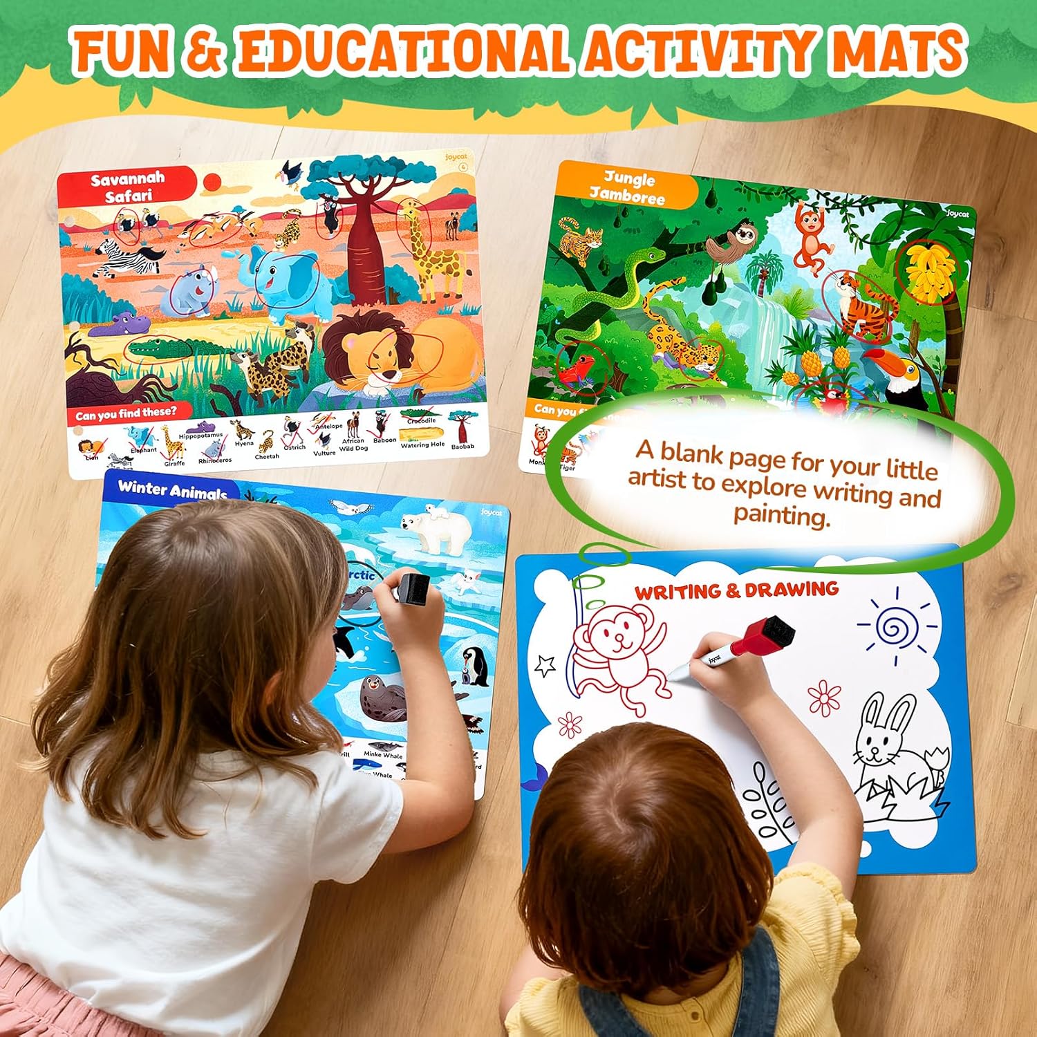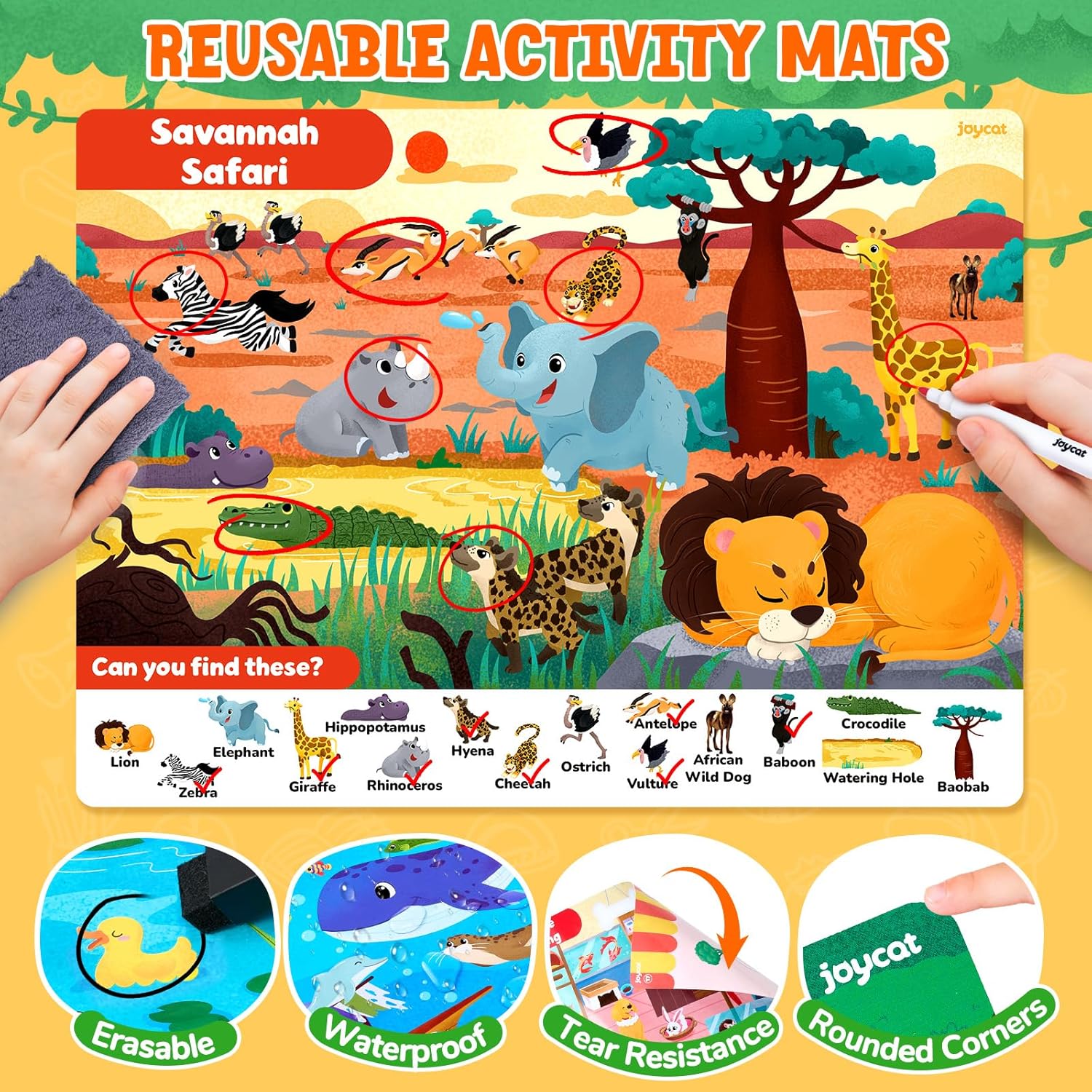 Safe & Reusable Design: Crafted for preschoolers ages 3-8, the mats feature long-lasting paper that is waterproof, tear-resistant, and odor-free. The rounded corners ensure safety, preventing scratches. The pages can be easily wiped clean with a damp cloth or the included dry erase cloth, allowing for endless reuse. Bright colors, clear patterns, and a child-safe design make this a toy you can trust.