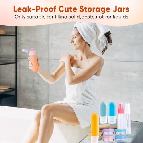 Travel Size Toiletries:Our Travel Containers for Toiletries Set contents 4 travel bottles, 4 travel jars, 2 spray bottles, 4 spatulas, 1 funnel, 1 cleaning brush, 1 label sheet, and 1 transparent cosmetic bag. Whether you’re embarking on a long vacation or a quick business trip, our travel size bottles are the ideal solution for packing efficiently