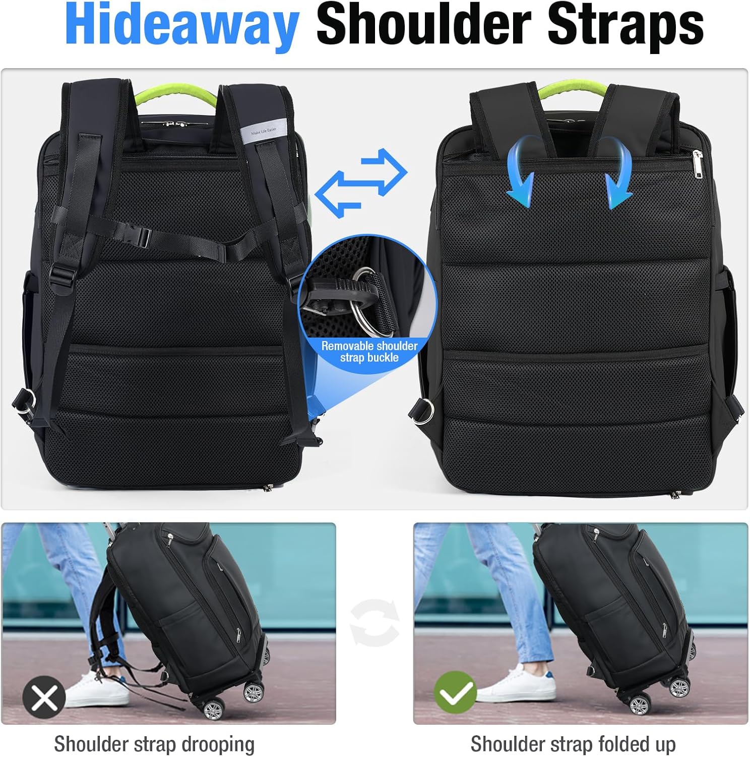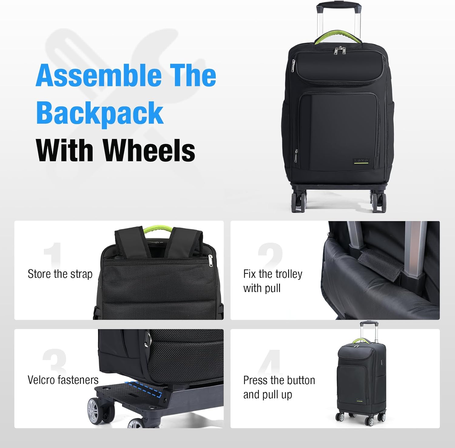 [Easy Conversion to Wheeled Trolley Bag]-Quickly transform this backpack into a convenient trolley bag, installing four rollers, pulling out the base clips fully, securely inserting the backpack into the base(Make sure the clip is firmly stuck in the base), and secure it in place with Velcro straps for stable, hands-free mobility.