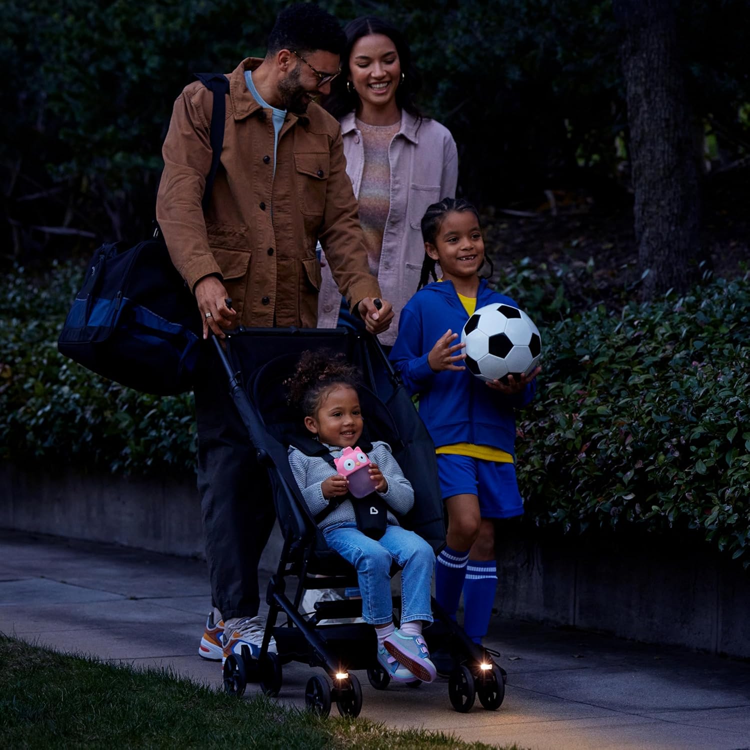 Looking to upgrade baby’s nighttime adventures? Lighten your physical and mental load with the Night Owl Travel Stroller with Lights! Featuring convenient one-touch headlights, this foldable travel stroller goes from day to night with ease, illuminating your path and keeping you safe and visible from a distance. With a sleek, ultra-compact, collapsible design that fits easily in car trunks and overhead bins, this small but mighty stroller is the ultimate travel companion for families on the move. No assembly needed — just unfold and go. Night Owl is always ready for the next destination, no matter what time of day!