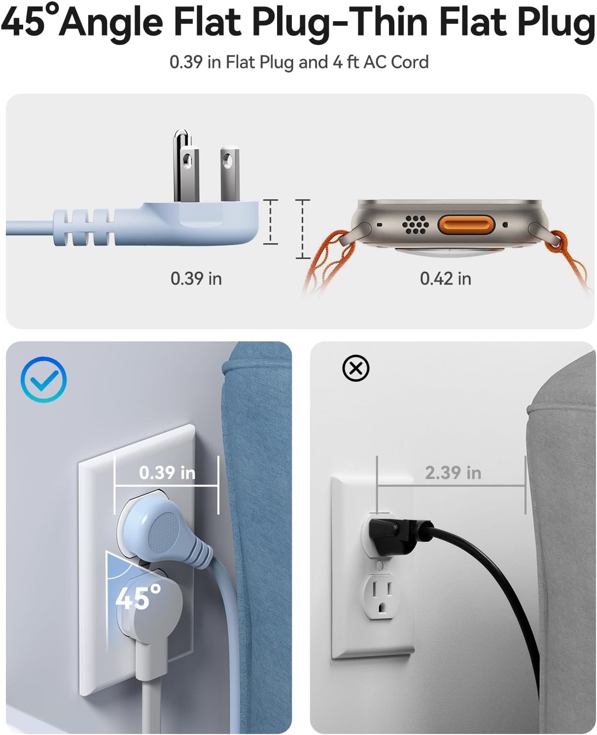 45° Angle Thin Flat Plug:This plug features a 45 ° angled design and a compact appearance (0.39 inches thick), 4.43ft undetachable extension cord, making it easy to plug and unplug in narrow spaces and effectively avoiding blocking adjacent sockets.