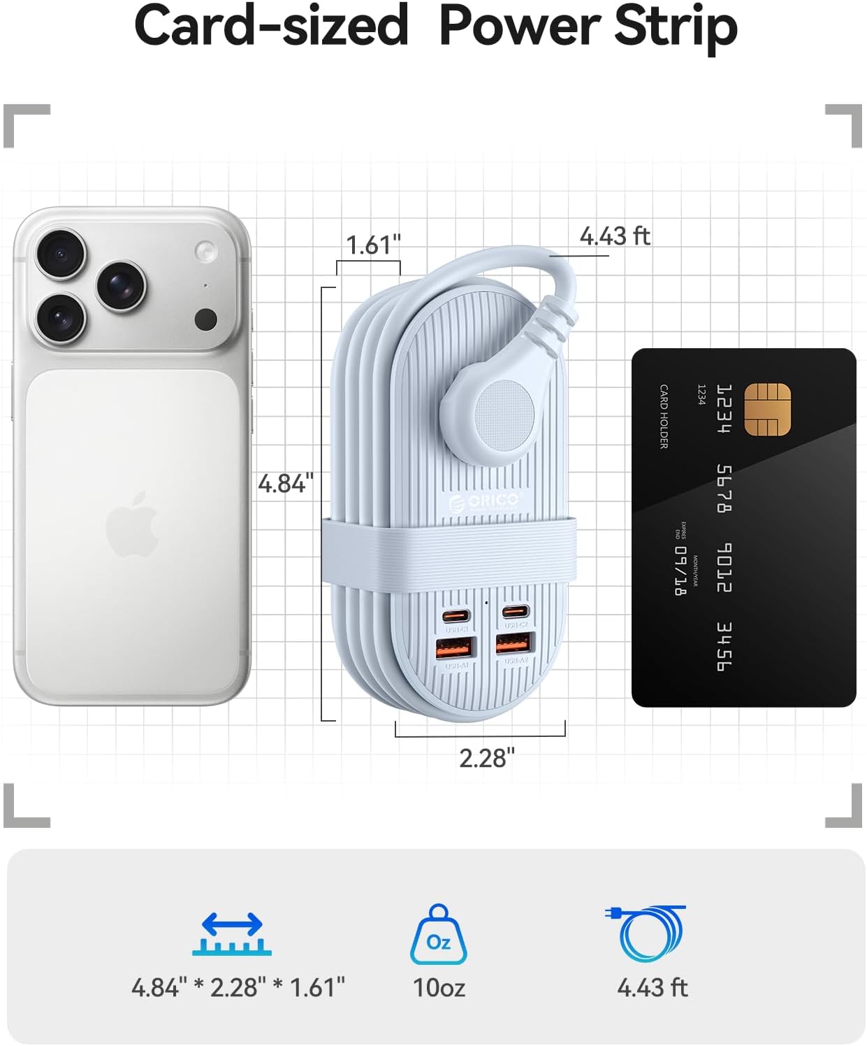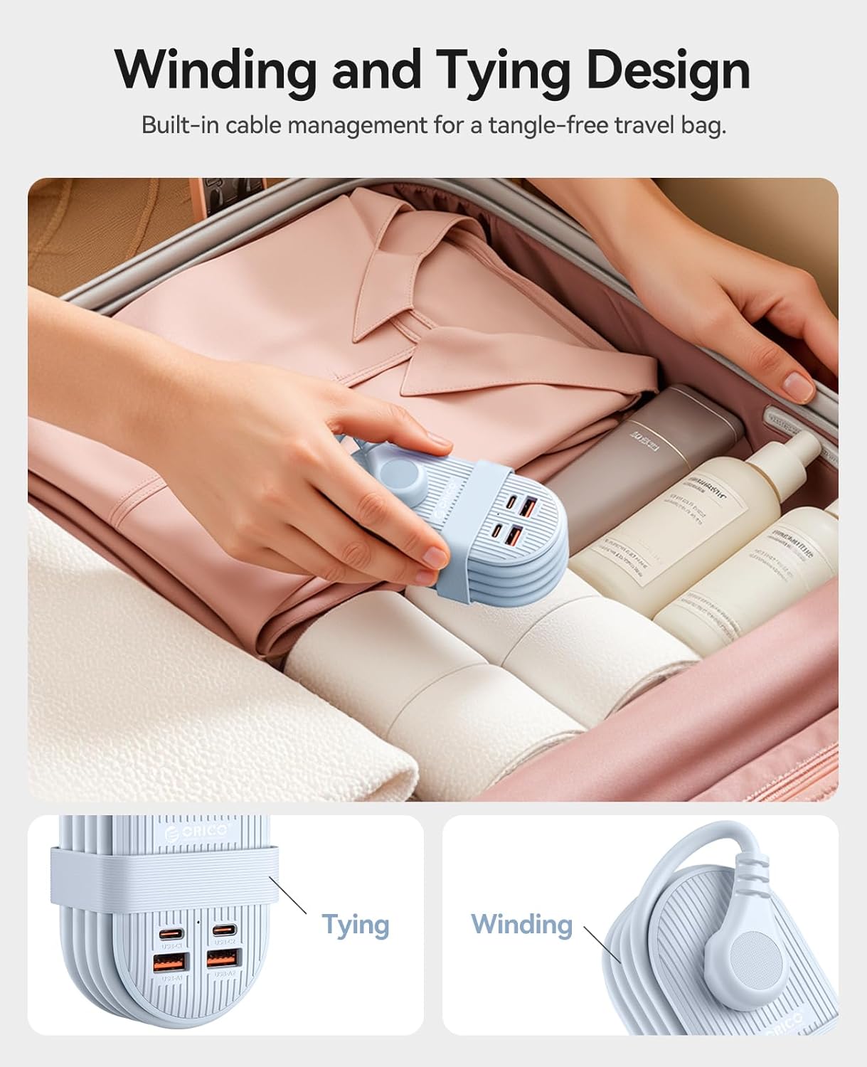 Winding and Tying Design: The design cleverly secures the extension cord to the product and comes with a dedicated strap, eliminating the problem of tangled wires. The overall appearance is simple and neat. Its size is only 4.84x 2.28 x 1.61inch, occupying no space whether it is placed in a suitcase or a backpack.