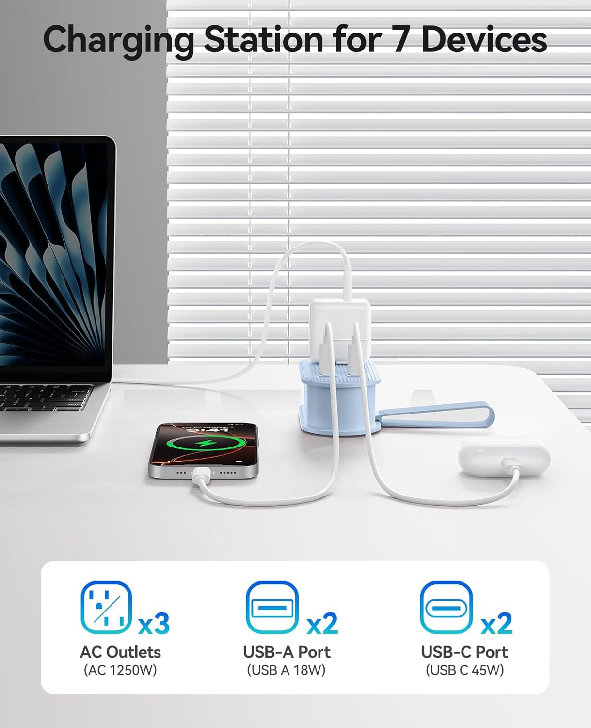 7-in-1 Charging Station: Charging station simultaneously supports 7 devices, including 3 AC outlets, 2 USB-A(18W), and 2 USB-C(45W), USB total output(27W+12W). You can also supply power to household appliances such as projectors, monitors, or hair dryers, making it perfect for charging at home, offices, libraries, dormitories, travel, cruise ship and other places.