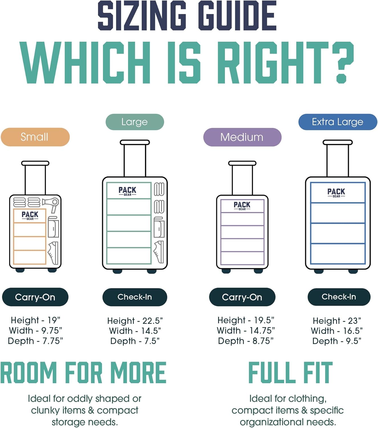 Which One is Right for Me? – Our Small Suitcase Organizer easily fits carry-on bags at the airport to keep things tidy. Use the Sizing Guide from our photos to choose the perfect organizer