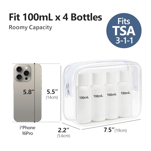TSA Approved: 3 Pack – Same Medium Size, 7.5”L x 2.2”W x 5.5”H. Clear travel toiletry bag strictly follows TSA 3-1-1 liquids rule for carry-on bag of all airlines, so you can easily and quickly pass through security screening with it in the airport
