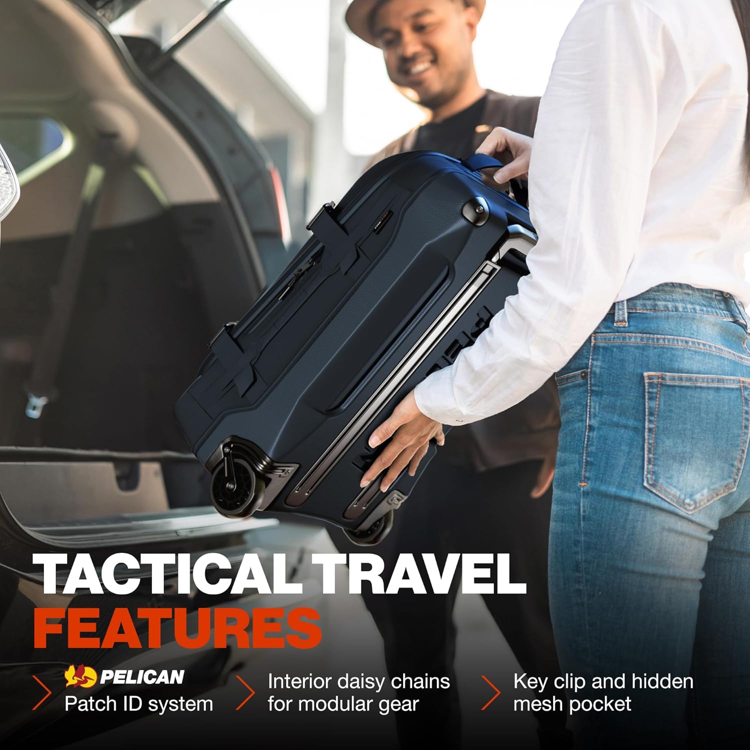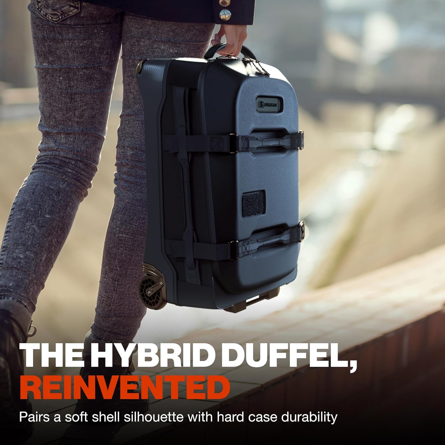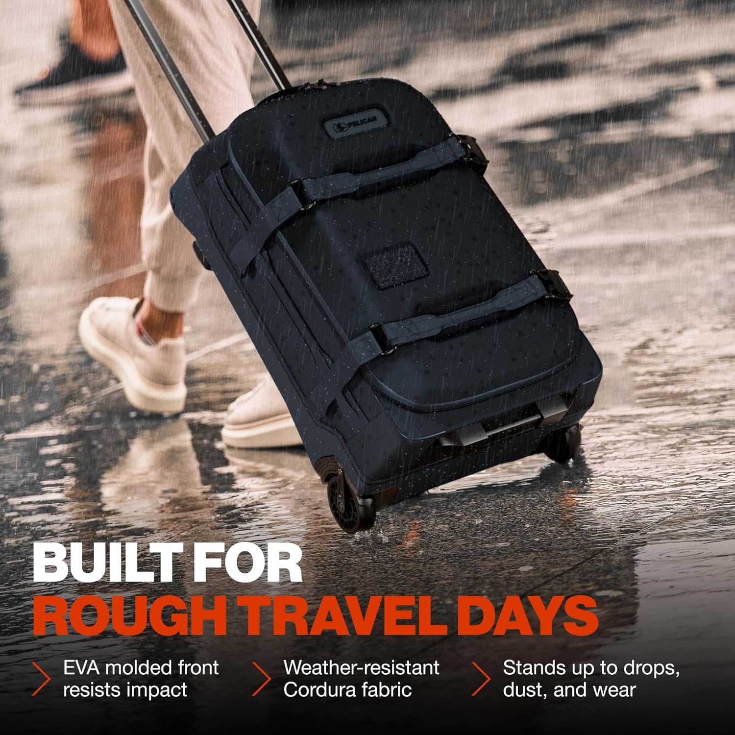 EXTERNAL FEATURES: Pelican Shield durable EVA molded front shell, weather-resistant 500D cordura fabric, Pelican Patch ID tag system, heavy-duty, oversized wheels, multi-stage extension handle, multiple compression straps, easy-grab handles throughout, external quick access zipper.