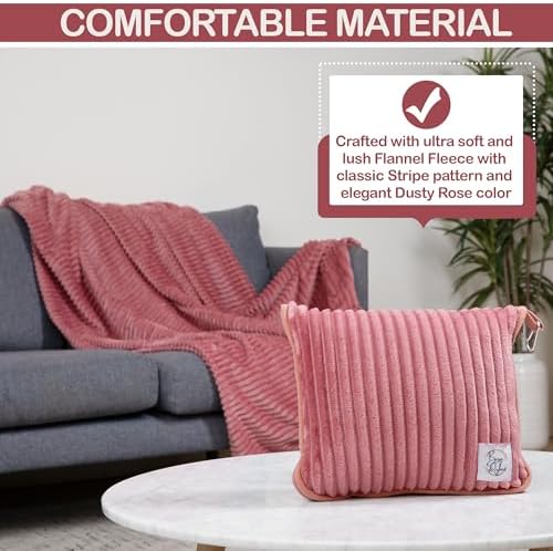 𝐖𝐚𝐫𝐦𝐭𝐡 𝐖𝐡𝐞𝐫𝐞𝐯𝐞𝐫 𝐘𝐨𝐮 𝐖𝐚𝐧𝐝𝐞𝐫: Our Carefully Crafted fleece packable travel pillow blanket is ultra soft and lush, This fuzzy airplane blanket features a beautiful dusty rose color with classic stripe pattern that provides the utmost coziness and comforting touch with warmness wherever you are. Our packable travel blanket is one of several traveling essentials that makes travel easier!