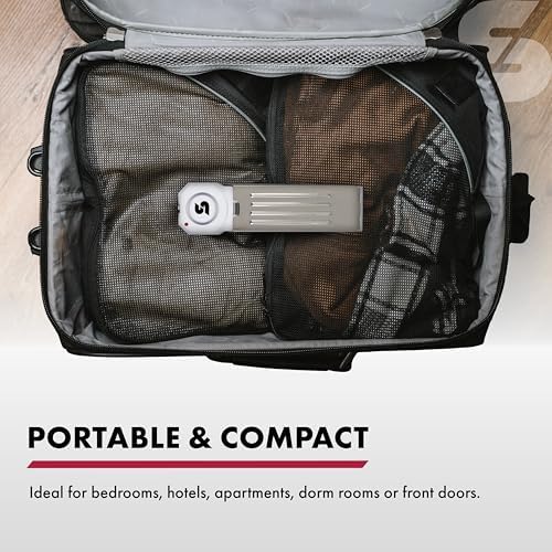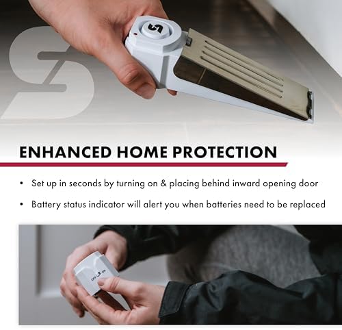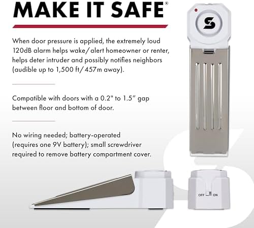 A burglary occurs every 14.5 seconds in the U.S., and budget cuts have led to an average 911 response time of 10 minutes. Furthermore, without the ability to install a home security system, renters and travelers can have a hard time feeling secure in their temporary housing. SABRE’s Door Stop Alarm is a great solution to either help fortify an existing home alarm system or use on its own in a bedroom, dorm, hotel room or apartment. The extremely 120dB loud alarm is audible up to 1,500-feet (455-meters) away and sounds when door pressure is applied. It is compatible with doors that have a 0.75″ gap between the floor and bottom of door (if the gap is greater, the alarm will not be able to activate when the door is opened). The alarm is coupled with a non-skid pad to prevent the door from opening. This attractive, premium white alarm installs easily in just seconds – simply slide it under the crack of an inward-swinging door. There’s no wiring needed, so the alarm works during power outages. Requires 1x9V battery (not included). A small Philips Head #1 size screwdriver is required to remove battery compartment cover. For an extra level of security, the Door Stop Alarm provides a battery status update via a low battery indicator. The Door Stop Alarm was developed by SABRE, the #1 pepper spray brand trusted by police and consumers worldwide, meaning this product is extremely reliable. Backed by over 45 years in the security industry, SABRE products must pass rigorous quality assurance testing before leaving our facilities to give you peace of mind. Improve your home security today.
