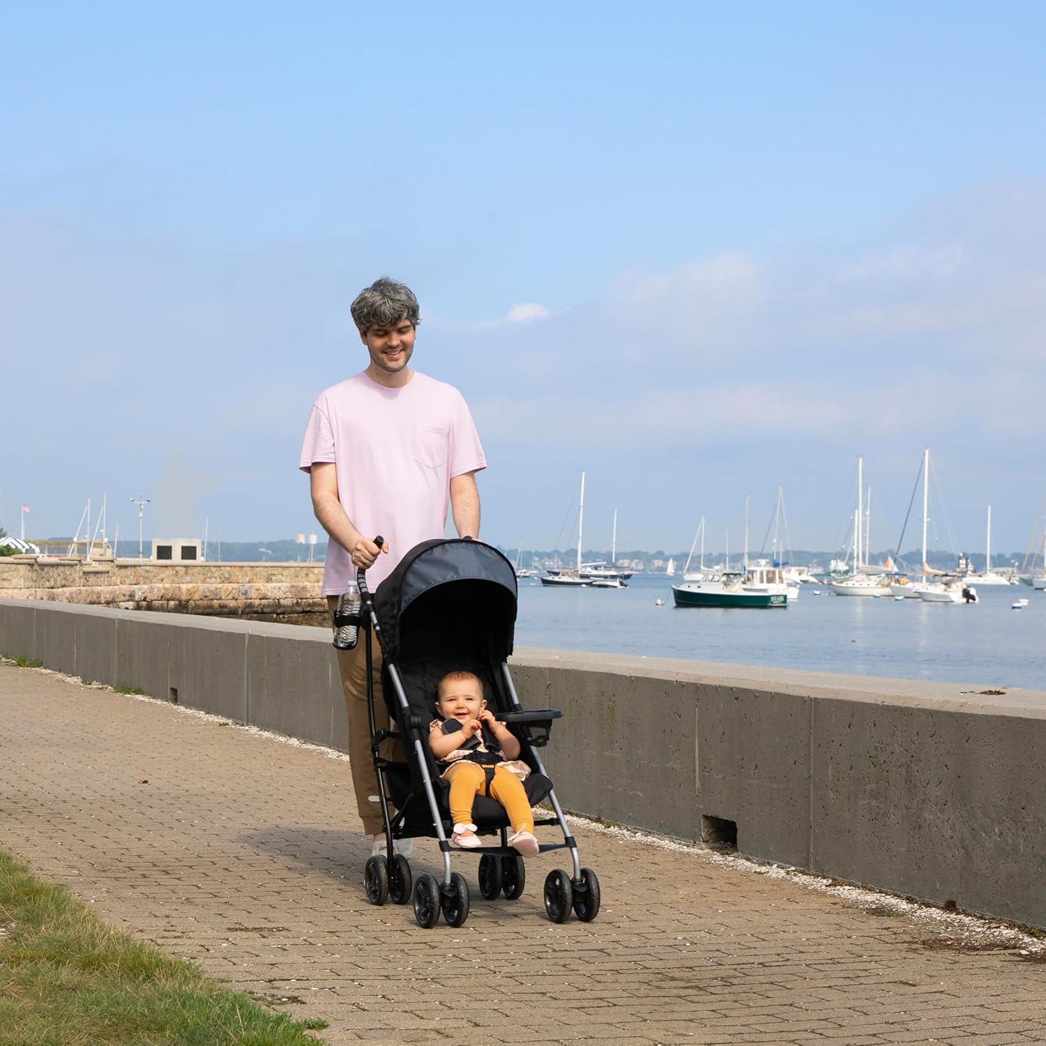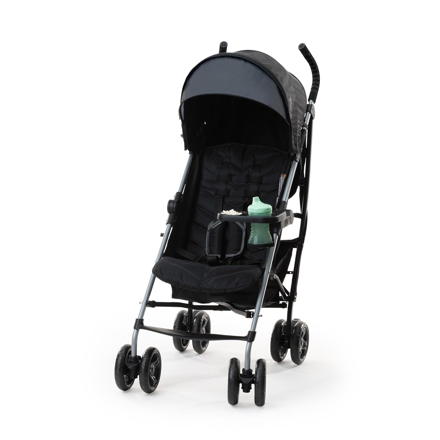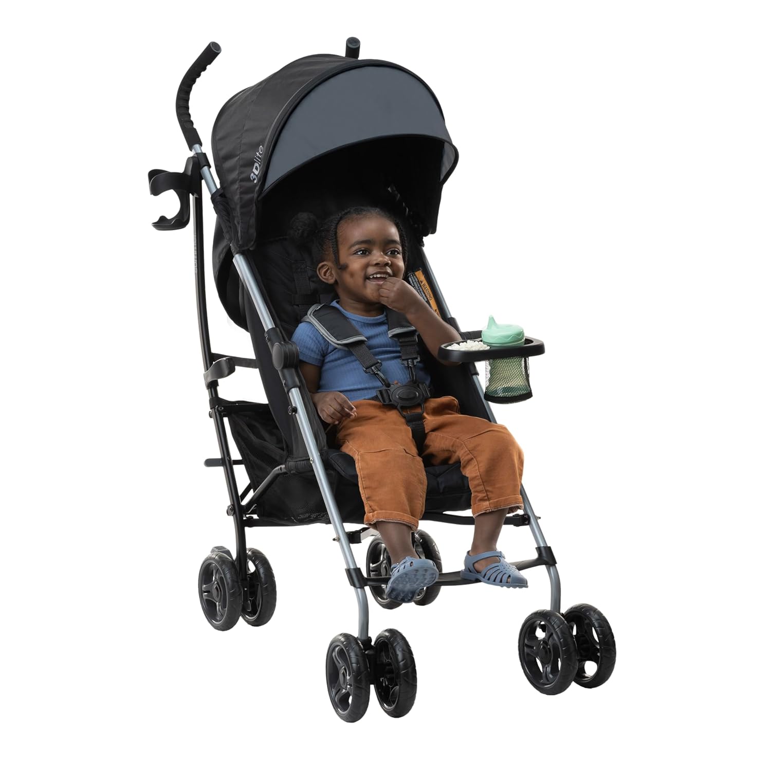 Keep things light for your family’s everyday adventures with the Summer by Ingenuity 3Dlite Convenience Stroller. Weighing in at just over 14 pounds, this lightweight stroller features an easy-to-fold compact frame that makes it easy to stow and go. Little ones will feel comfortable and secure thanks to its multi-position recline, a 5-point safety harness, and an extended pop-out sun visor with UPF 50+ made from recycled fabrics that help protect their delicate skin. An integrated child cup holder and snack tray folds with the stroller for the ultimate convenience. Parents will enjoy a cup holder, a convenient storage pouch, an easy-to-access storage basket, cushioned handles, a carry strap, and lockable rear wheels for safety. Take your tot for a super-smooth ride thanks to anti-shock front wheels (maximum weight for toddlers is 50 pounds). Whether you’re taking a spin around the neighborhood or strolling through the airport, the 3Dlite is the ideal stroller for travel or every day.