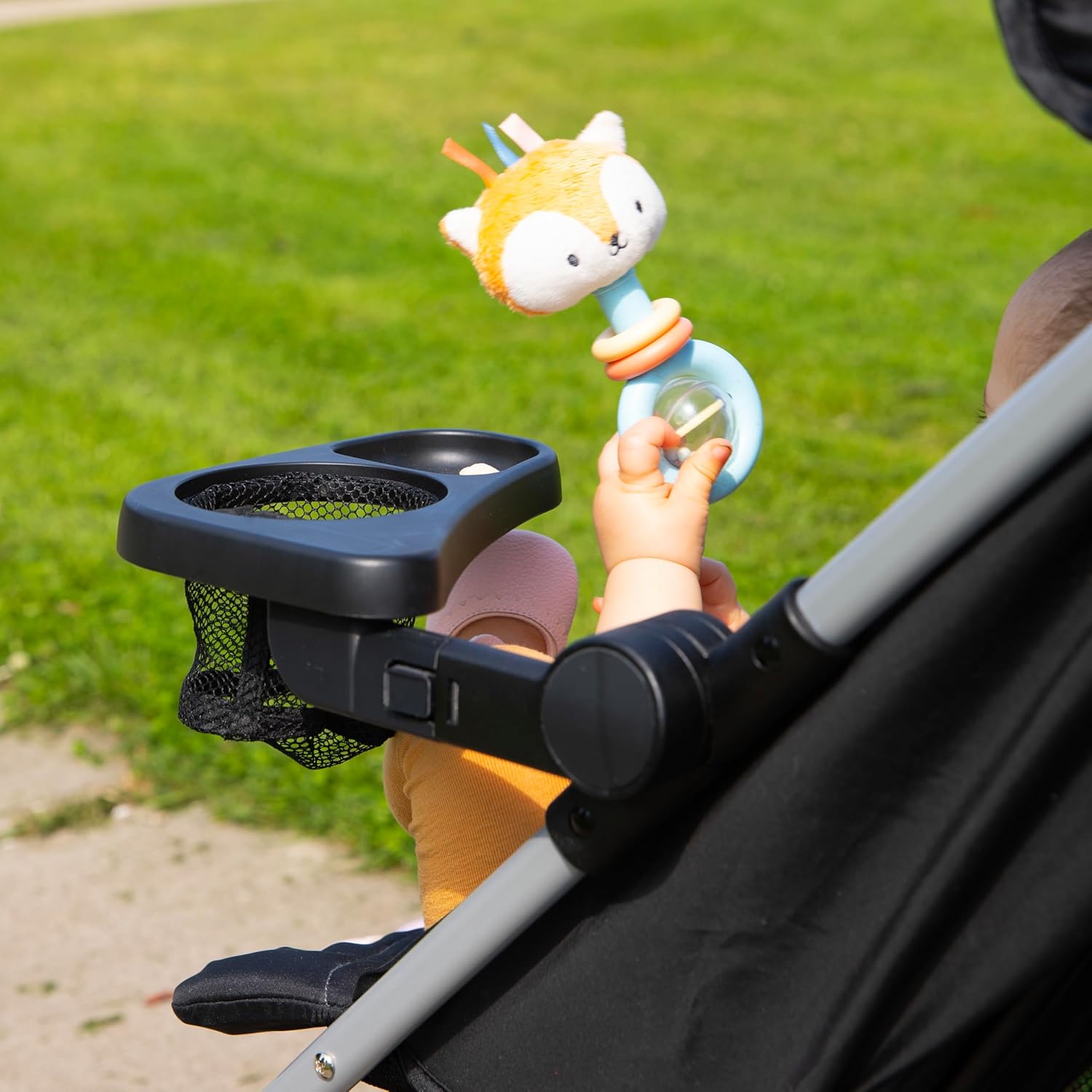 Integrated child snack tray and cup holder fold with stroller; parent features include a cup holder, rear storage pocket, cushioned handlebars, and easy-access storage basket