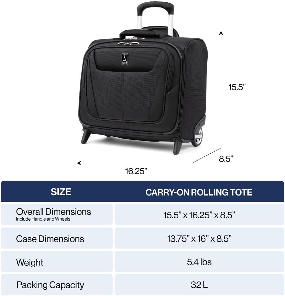 Meet your new travel essential: the Maxlite 5 Rolling Tote. Ultra-lightweight and versatile, it works as a stackable companion to your carry-on or as a compact all-in-one bag for short trips. A roomy interior, quick-access front flap, and multiple pockets keep essentials and electronics organized. Smooth ball-bearing wheels and a rear stacking strap provide hands-free mobility and secure stacking atop larger luggage. Fit-to-Fly tested to fit overhead bins on most major U.S. airlines. Backed by Travelpro’s Limited Lifetime Coverage and 1-year Trusted Companion Promise, covering repairs and shipping for airline or carrier damage.