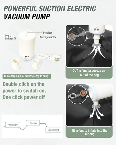 Vacuum system: We’re including an electric vacuum pump with every purchase (Charge cable included) .Press the switch on the electric pump twice, and it will spring into action immediately, rapidly removing air from the bag. Its powerful suction ensures a tight vacuum seal is achieved in no time which drastically reduces the volume of your stored items.Once you’re finished, a single press of the switch turns the electric pump off.