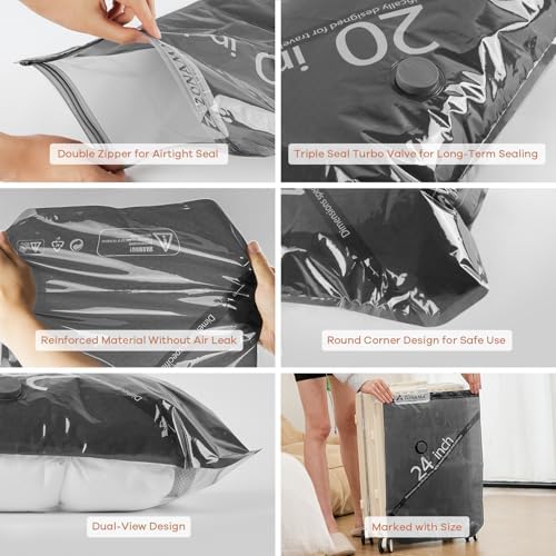 【Versatile 4-Size Set for Every Need】This complete set includes 22 bags in four versatile sizes(15.75×21.65in, 15.75×23.62in, 19.39×29.53in, 19.69×31.5in), making it the perfect solution for all your space-saving needs. Perfect for organizing your travel essentials! Keep your clean clothes separate from dirty during the trip, save valuable space for your suitcase, travel backpack, or handbag and seamlessly switch to home storage for seasonal clothing, blankets, and bedding